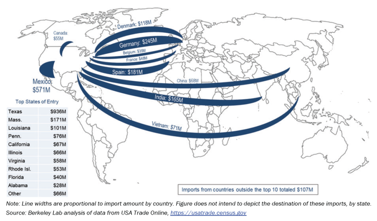 En el pasado congreso de la AEE, el antiguo representante de la UE para asuntos internacionales José Borrel preguntó a la audiencia sobre las exportaciones de equipos a eólicos a EEUU y la posible afección de los nuevos aranceles propuestos por la administración de este país. Dada mi posición en la sala, no escuché ninguna respuesta, por lo que sirva esta introducción para mencionar que de acuerdo con el Berkeley Lab, España exportó 180 M€ en el año 2023, muy por debajo de otros países con menor “tradición” eólica como México e inferior también a las exportaciones de 240 M€ solo de un año antes.