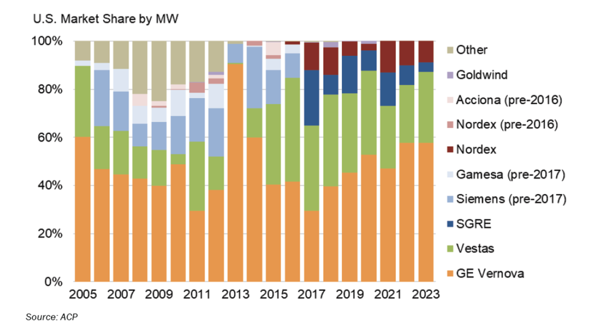 Por lo que respecta a la energía eólica y según las mismas fuentes, el reparto del mercado por fabricantes se presenta en la Figura siguiente, con la posición dominante de GE VERNOVA, la filial eólica de GE y sin prácticamente la presencia china, y aunque el origen de las máquinas es independiente de la nacionalidad de la marca, el argumento de la administración norteamericana es débil pues haciendo una proyección de las importaciones, solo el 30% de lo instalado se fabrica fuera de las fronteras, concentrado en palas y bujes, y ha decrecido fuertemente desde el año 2020.