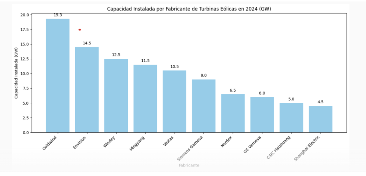 Tomando el caso de la eólica, y a modo de ejemplo, en la figura siguiente se presenta la capacidad instalada por fabricantes en el mundo (compárese con el caso americano antes presentado y con el Europeo posterior) donde se ve que el primer fabricante no chino está en cuarta posición y gracias principalmente al mercado europeo, en lenta recesión.