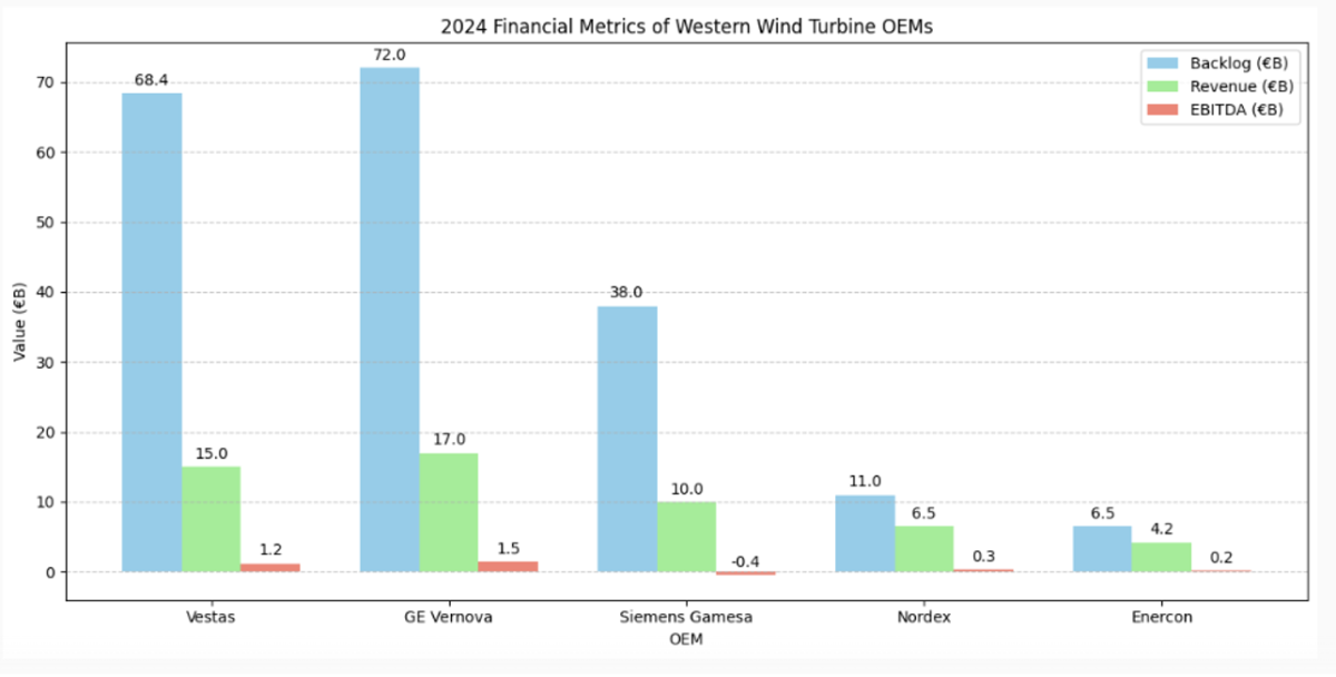 Para complicar las cosas, la situación de la industria eólica occidental es cada vez más comprometida (ver la Figura siguiente): no solo los fabricantes no ganan dinero, también les sucede algo similar al conjunto de la cadena de suministro exclusivamente eólica (por ejemplo, los fabricantes de rodamientos dependen más de la industria automovilística), lo cual lleva a la lección de que siempre que sea posible, es recomendable diversificar los sectores y tipología de clientes, tarea no siempre sencilla.