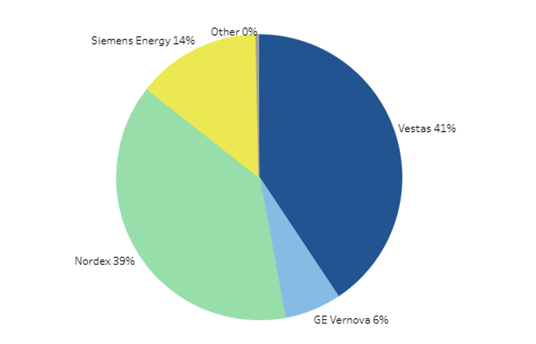 En la figura siguiente se presenta el porcentaje de potencia instalada en la UE en el 2024 por fabricante para una potencia total de 16,4 GW con una reducción de la instalada solo un año anterior del 11%.
