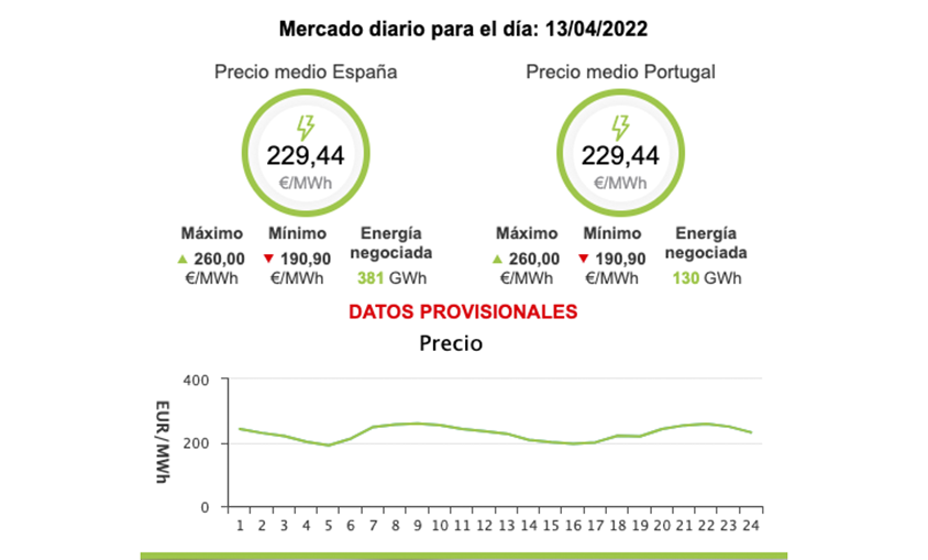 En comparación con hace justo un año, el precio del 'pool' para este miércoles será un 203,9% superior a los 75,5 euros/MWh del 13 de abril de 2021.