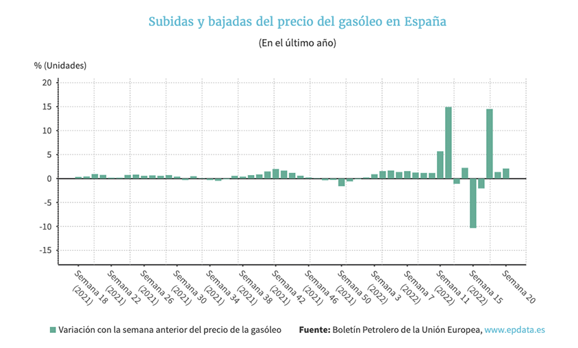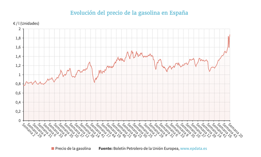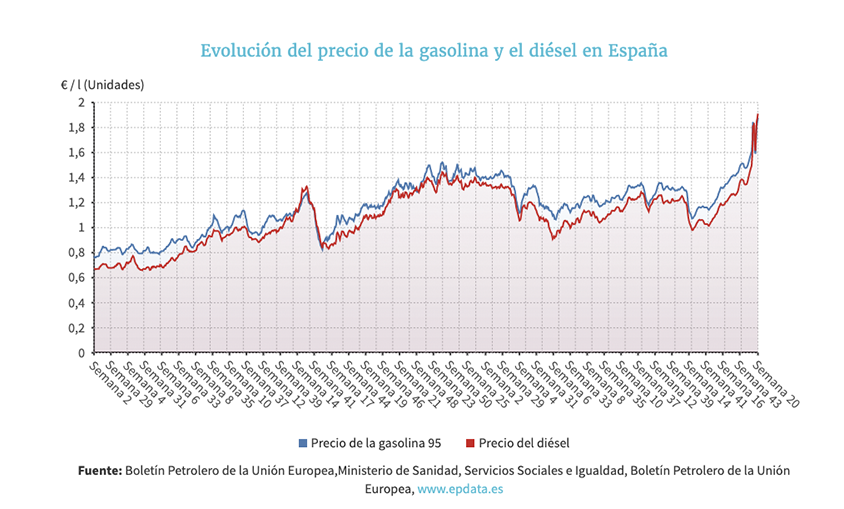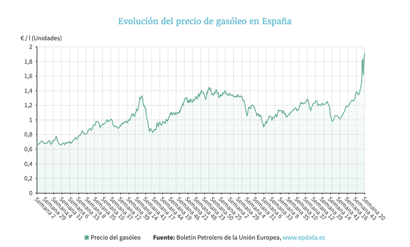 Según los datos del Boletín Petrolero de la Unión Europea (UE) recogidos por_ Europa Press_, los 1,911 euros por litro del gasóleo representan un nuevo máximo histórico, superando los 1,872 euros de hace una semana, al incrementarse un 2,08%.
