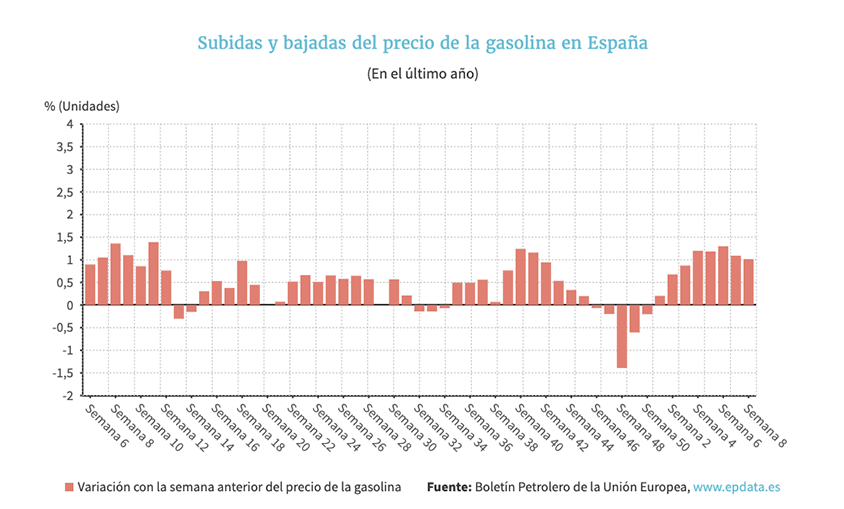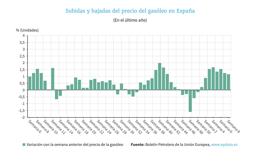 En concreto, ambos carburantes han encadenado esta semana su octava subida consecutiva. En el caso del diésel, acumula ya un encarecimiento del 9,8% en lo que va año, mientras que en el de la gasolina es del 7,57%.