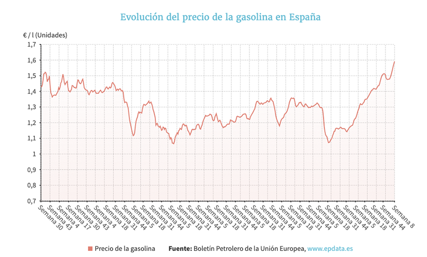 El precio medio del litro de gasolina se ha situado en los 1,591 euros, sumado así su cuarto récord histórico seguido, tras encarecerse un 1,01% con respecto a la pasada semana, según datos del Boletín Petrolero de la Unión Europea recogidos por Europa Press.