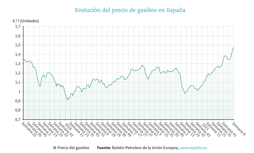 Por su parte, el precio medio del litro de gasóleo se ha situado esta semana en los 1,479 euros, remontando un 1,16% frente a hace siete días y estableciendo así su segundo máximo histórico consecutivo.