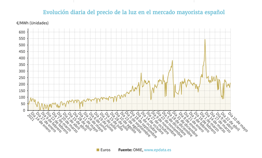 Respecto a hace un año, el precio medio de la electricidad para este lunes será un 252% más caro que los 59,26 euros/MWh del 10 de mayo de 2021.