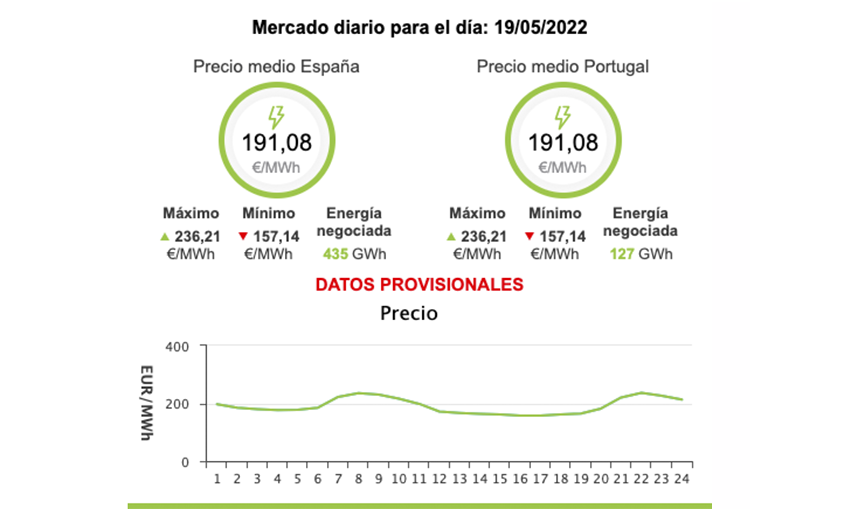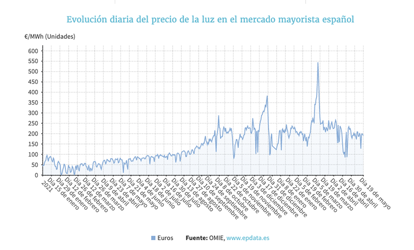 Respecto a hace un año, el precio medio de la electricidad para este jueves será un 152,7% más caro que los 77,11 euros/MWh del 19 de mayo de 2021.