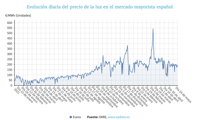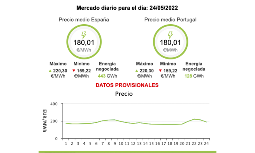 Respecto a hace un año, el precio medio de la electricidad para este martes será un 167,08% más caro que los 67,4 euros/MWh del 24 de mayo de 2021.