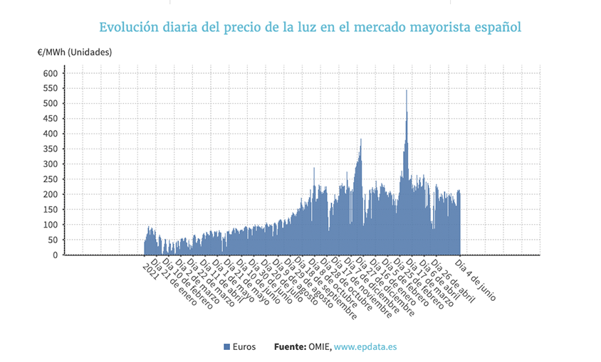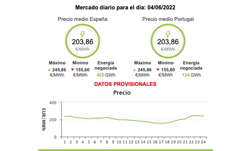 Respecto a hace un año, el precio medio de la electricidad para este sábado será un 152,95% más caro que los 80,59 euros/MWh del 4 de junio de 2021.
