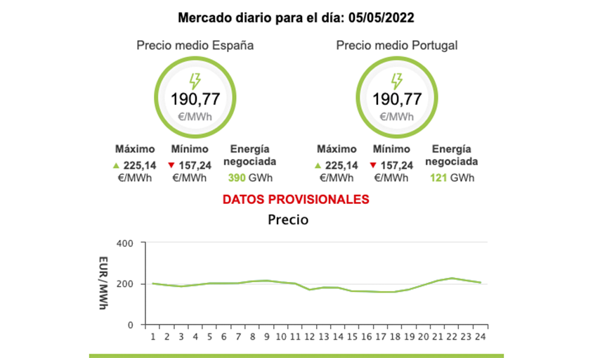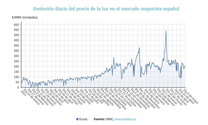 Respecto a hace un año, el precio medio de la electricidad para este miércoles será un 152% más caro que los 75,71 euros/MWh del 5 de mayo de 2021.