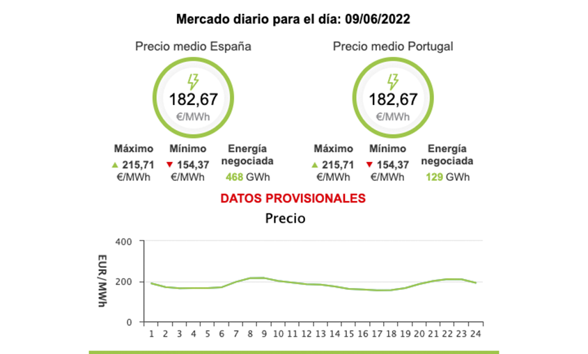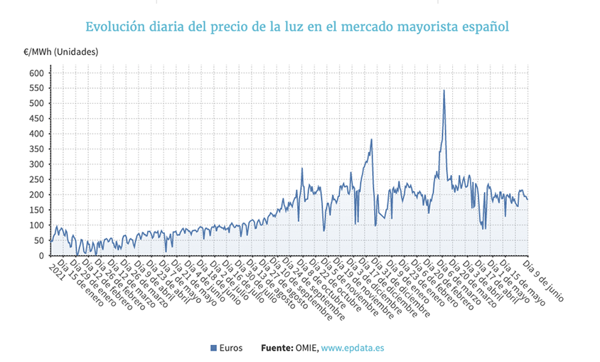 Respecto a hace un año, el precio medio de la electricidad para este jueves será un 123,86% más caro que los 81,6 euros/MWh del 9 de junio de 2021.