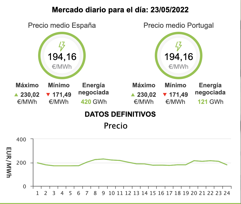 Respecto a hace un año, el precio medio de la electricidad para este lunes es un 182,74% más caro que los 68,67 euros/MWh del 23 de mayo de 2021.