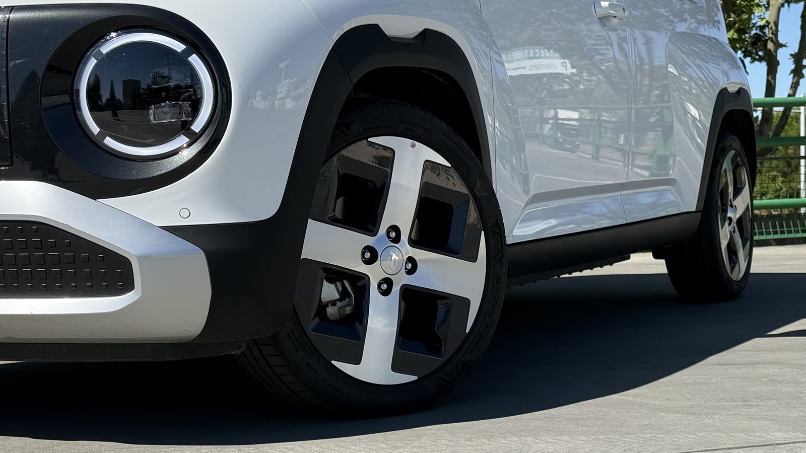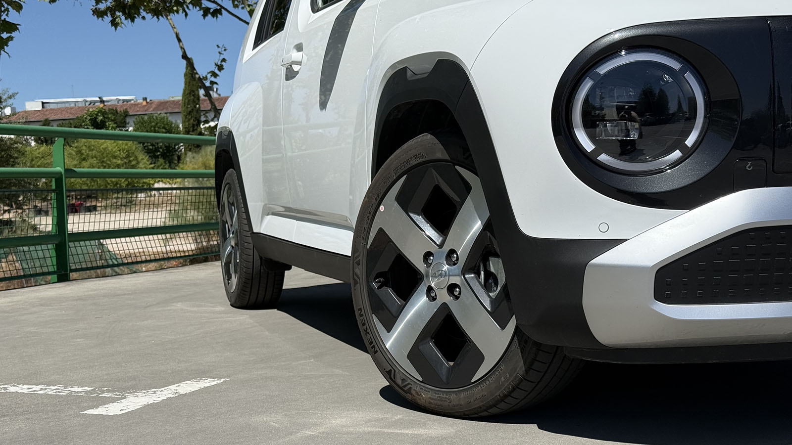 Ahora bien si tuviéramos que destacar algunos elementos de este coche, que por cierto solo mide 3,82 metros de largo, serían la doble luz diurna delantera, con esta tira superior y esta circular inferior que guarda simetría con la trasera y sin salir del apartado lumínico, tenemos también luces con forma de píxel en la zaga; las barras sobre el techo o la forma de esta puerta trasera, en la que no solo se esconde el tirador en el marco sino que ofrece una ventanilla con más superficie que la delantera y eso redundará en una mayor sensación de espacio. El resto de elementos son las llantas de entre 15 y 17 pulgadas, siendo estas últimas las exclusivas de nuestro acabado o los siete colores monotono para la carrocería y cuatro bicolor.