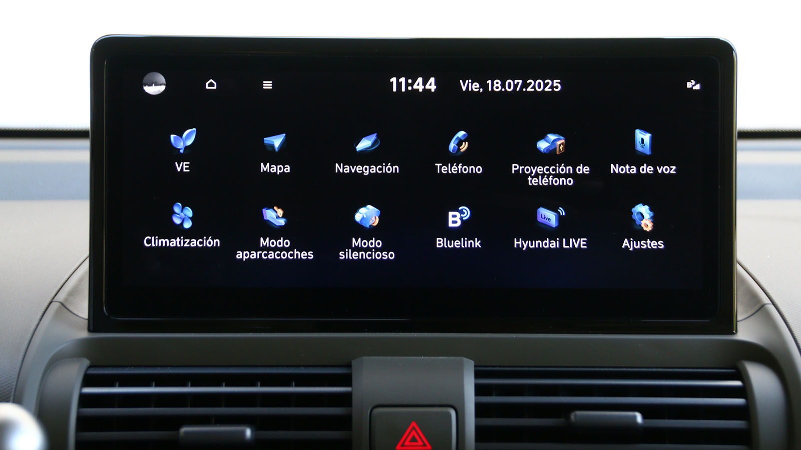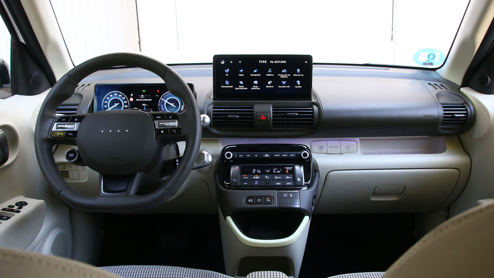De puertas para dentro la expresión que emplearíamos sería “se nota que es un Hyundai”. Una frase que se justifica no solo en la buena calidad percibida del conjunto, incluso pese a abusar de plásticos duros en la zona alta, frontal y los paneles de las puertas, sino también en la digitalización.