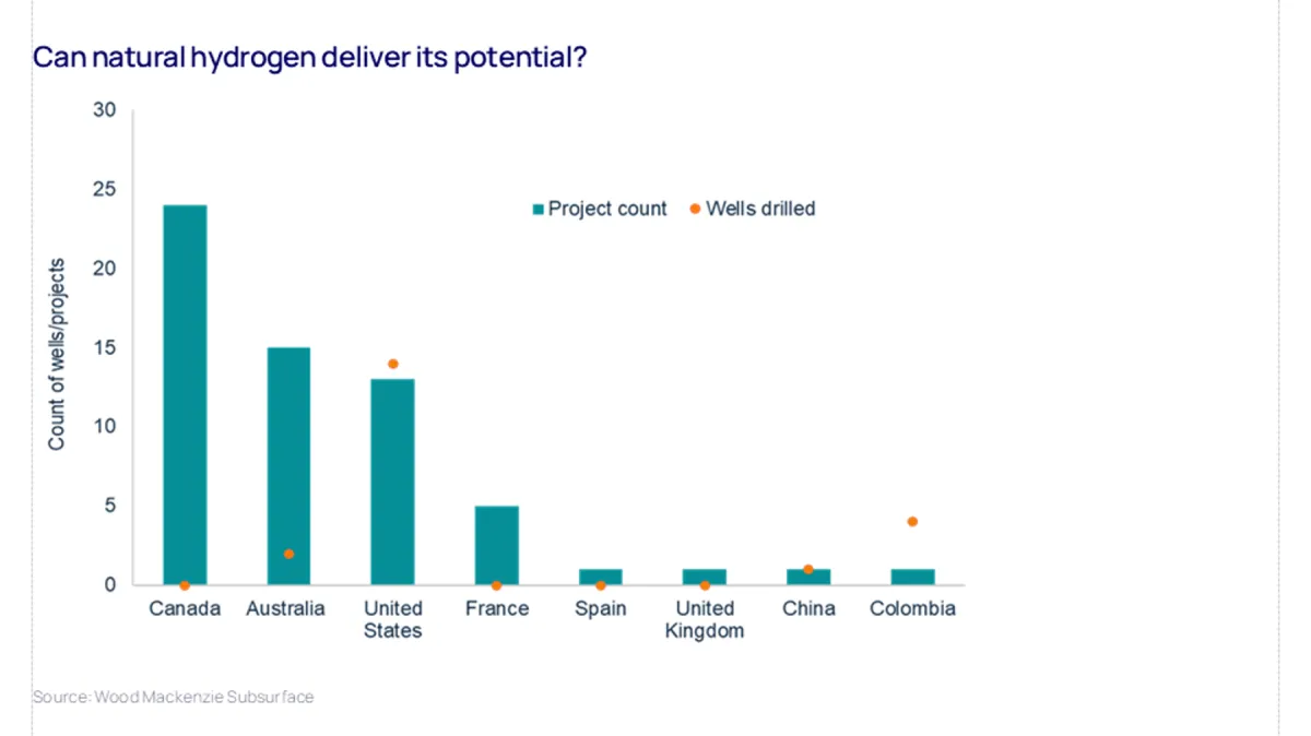 A pesar del estancamiento, empresas y gobiernos continúan explorando distintas opciones de suministro de hidrógeno. A diferencia del hidrógeno verde o azul, que requieren procesos de conversión ineficientes, el hidrógeno natural se presenta listo para usar y, potencialmente, a un costo mucho menor, según los analistas de Wood Mackenzie.