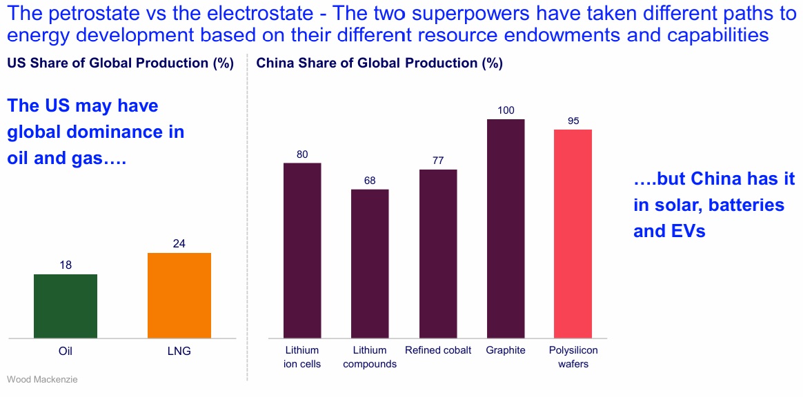 Las dos superpotencias globales han seguido estrategias energéticas muy diferentes que tendrán importantes implicaciones en sus futuros costos de energía. Mientras que EEUU goza de una posición fuerte en combustibles fósiles —controlando el 18% de la producción mundial de petróleo y el 24% de la producción de gas natural licuado (GNL)— China ha buscado un dominio casi total de los mercados globales relacionados con la energía solar, el almacenamiento en baterías y los vehículos eléctricos. Las líneas de una divergencia “petroestado” frente a “electroestado” comienzan a definirse con mayor claridad.