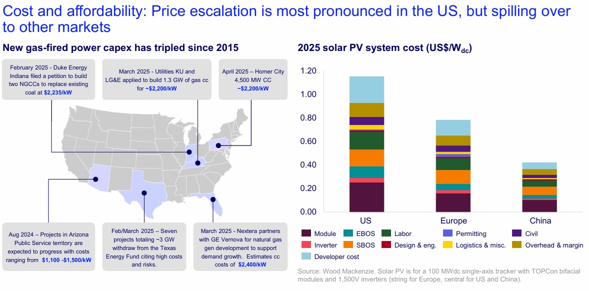 El consecuente aumento de precios es más evidente en EEUU, aunque ya se está extendiendo a otros mercados. En muchos estados estadounidenses, los costos de nuevas plantas de gas superan los 2.000 dólares por kilovatio (kW), y siguen subiendo, mientras que nuestros cálculos sitúan el costo promedio de los sistemas fotovoltaicos solares en EEUU en 1.150 dólares por kW, aproximadamente la mitad del coste de las nuevas plantas de gas. Anteriormente, el CAPEX solar solía ser menor que el de las plantas de gas.