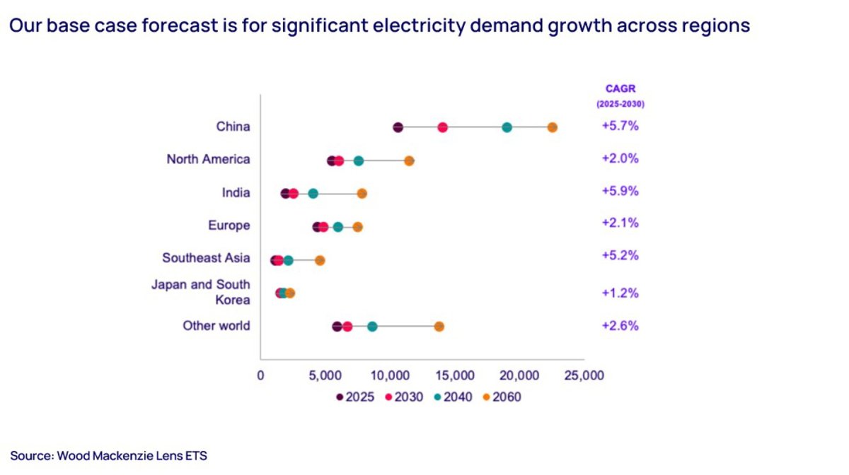 Wood Mackenzie espera que el crecimiento de la demanda se acelere gracias al desarrollo de los mercados emergentes, el avance de la electrificación y un auge de centros de datos impulsado por la IA