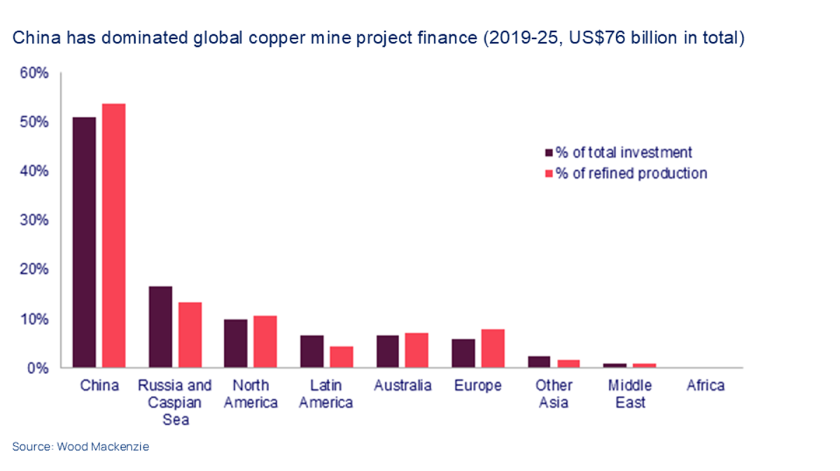 A diferencia de sus homólogos occidentales, los mineros chinos han buscado agresivamente oportunidades en jurisdicciones de mayor riesgo. De los 76.000 millones de dólares invertidos a nivel mundial en oferta de cobre greenfield y brownfield entre 2019 y 2025, alrededor del 50% procedió de mineros chinos.