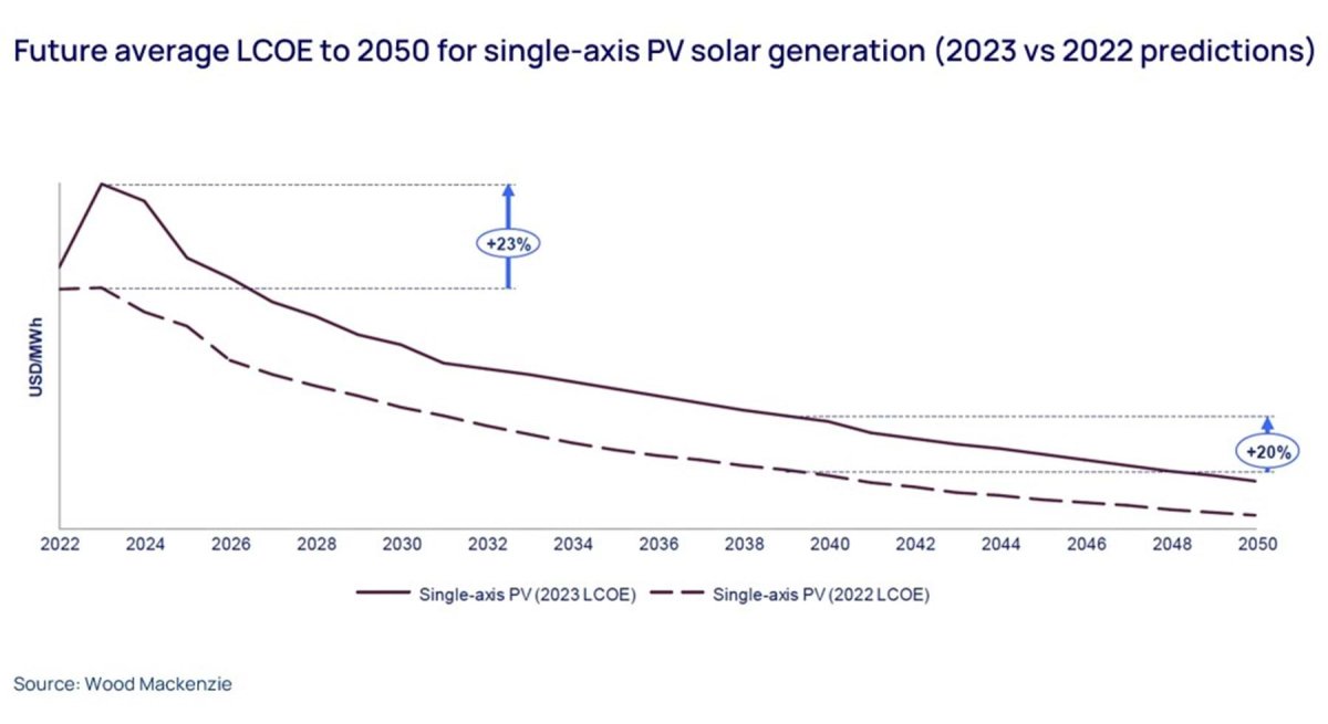 “Los costos de implementar energías renovables han aumentado significativamente en 2023”, dice Daniel Liu, responsable de costos Globales de renovables de Wood Mackenzie. Y para muestra, un botón: “El costo nivelado promedio de la electricidad (LCOE) para la generación fotovoltaica SAT en Europa ha aumentado un 23% interanual de 2022 a 2023. Si bien se espera que los costos disminuyan, prevemos que ahora serán un 20% más altos en términos reales. hasta 2050 (ver cuadro a continuación).