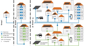 - Red de distribución: La energía fotovoltaica se comparte utilizando la red local pública en el nivel de bajo voltaje (la limitación es la misma subestación). En este caso, solo algunos consumidores deben aceptar participar en este modelo comercial. Esto significa que cada consumidor tiene su punto de conexión de red individual.