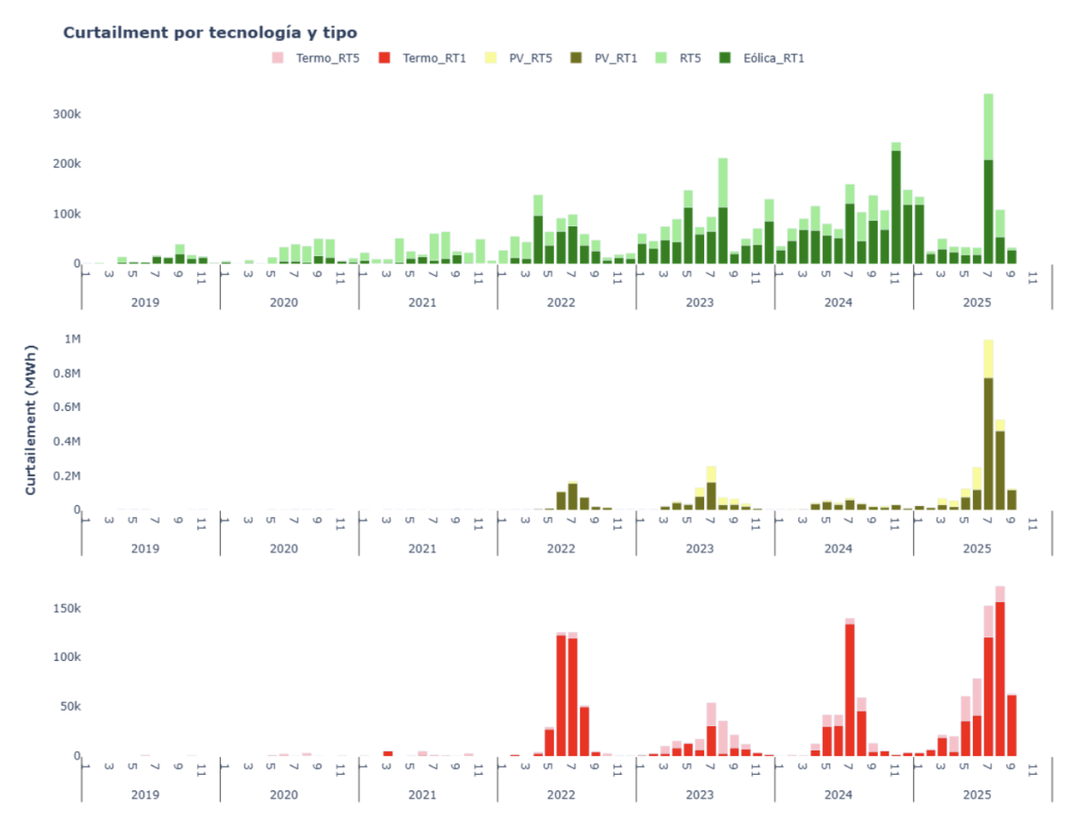 A este efecto se suma el cada vez más temido curtailment. En la eólica pese a un inicio de año bajo en términos de restricciones técnicas RT1 (curtailment del “malo”) en julio hemos vuelto a altos valores 200 GWh. Para la fotovoltaica se han roto todos los récords establecidos hasta ahora con un julio de restricciones cercanos a 800 GWh. Sin embargo se mantienen los valores estables para la termosolar pero con tendencia creciente.