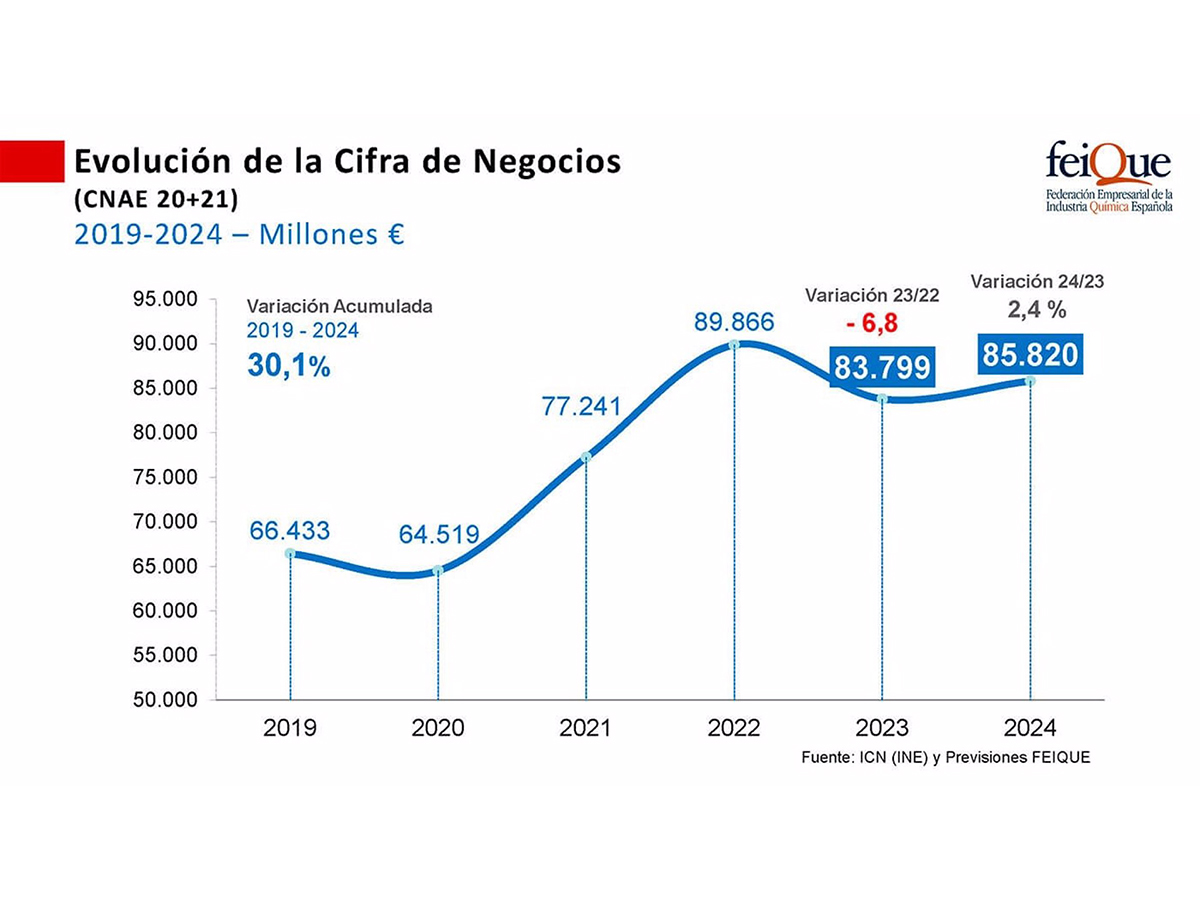 Desde 2019, la cifra de negocios de la industria química acumulará un crecimiento del 30,1% hasta 2024, aunque este crecimiento no está vinculado a la mejora de los niveles y capacidades productivas, sino fundamentalmente a los precios de los productos químicos, que en el periodo han crecido un 28,4%.