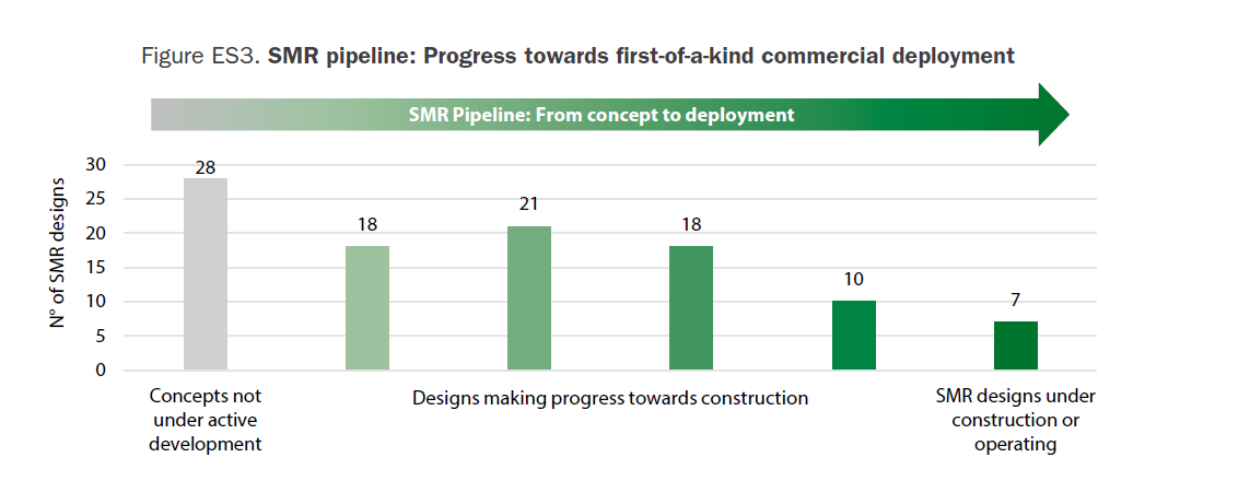 Las evaluaciones muestran que 51 diseños de SMR se encuentran en proceso de prelicencia o licencia en 15 países, y que existen aproximadamente 85 conversaciones activas entre desarrolladores de SMR y propietarios de emplazamientos en todo el mundo. También se han logrado avances en la preparación y financiación de la cadena de suministro.