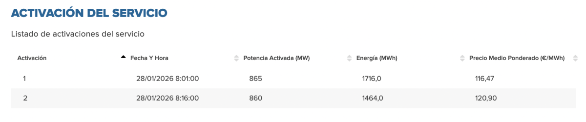 Según los últimos datos que ofrece Red Eléctrica sobre la aplicación del SRAD, se ha activado el servicio en dos ocasiones a partir de las 08.01 horas. Se trata de un primer bloque de 865 MW de potencia para un total de 1.716 MWh de energía que se ha abonado a un coste de 116,47 €/MWh.