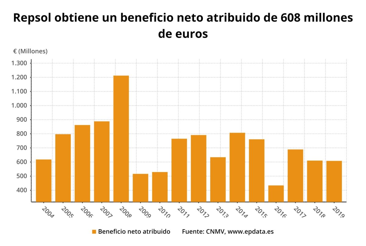 Repsol obtuvo un beneficio neto de 608 millones de euros en el primer trimestre del año, unas ganancias en línea con los 610 millones de euros del mismo periodo del ejercicio pasado, informó la compañía.