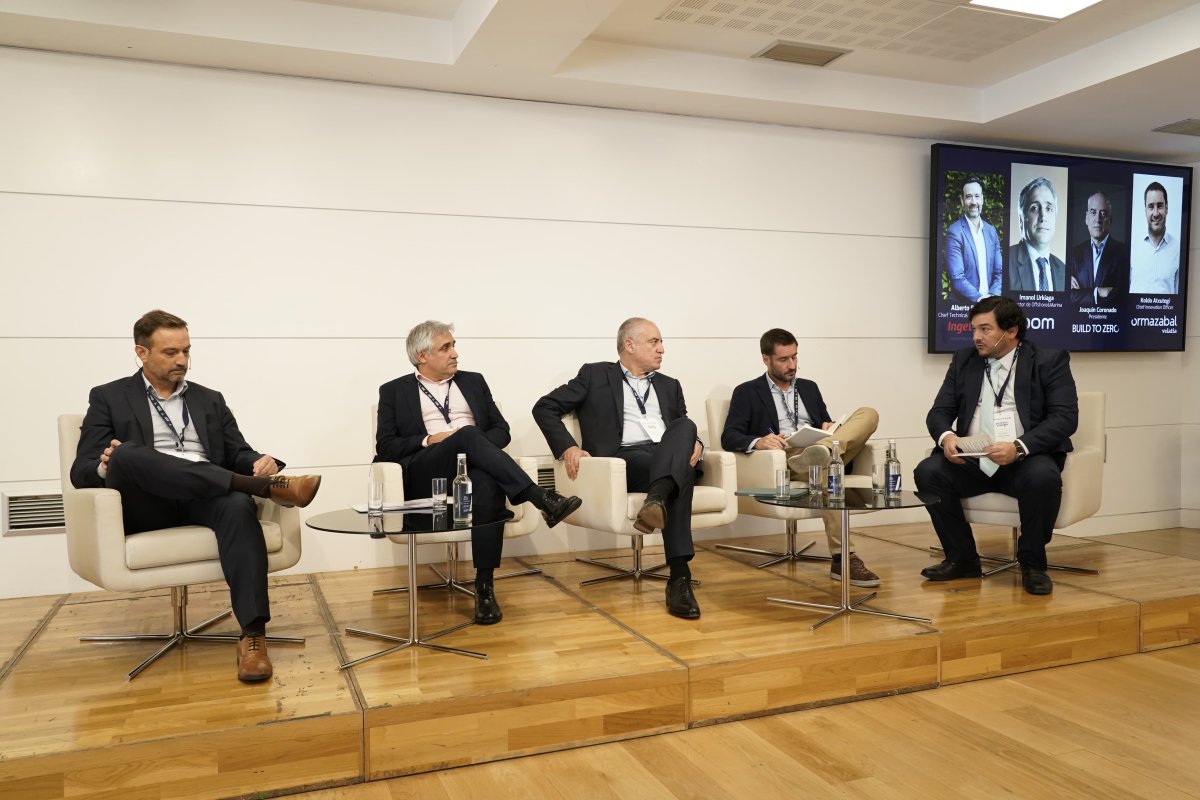 De izquierda a derecha: Alberto Guerrero (Ingeteam), Imanol Urkiaga ( Idom), Joaquín Coronado (Build to Zero), Koldo Atxutegui (Ormazabal) y el moderador Ramón Roca (Periódico de la Energía). FOTO: Fernando Gómez