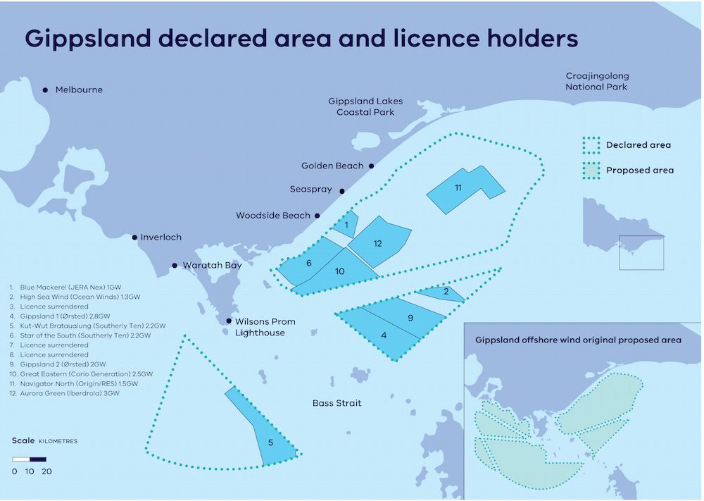 Australia aún no cuenta con parques eólicos marinos en operación, pero Victoria se ha fijado el objetivo de alcanzar 2 GW de capacidad offshore para 2032 y 9 GW para 2040, como parte de sus planes para pasar de los combustibles fósiles a las energías renovables y alcanzar un objetivo del 95 % de energía renovable para 2035.
