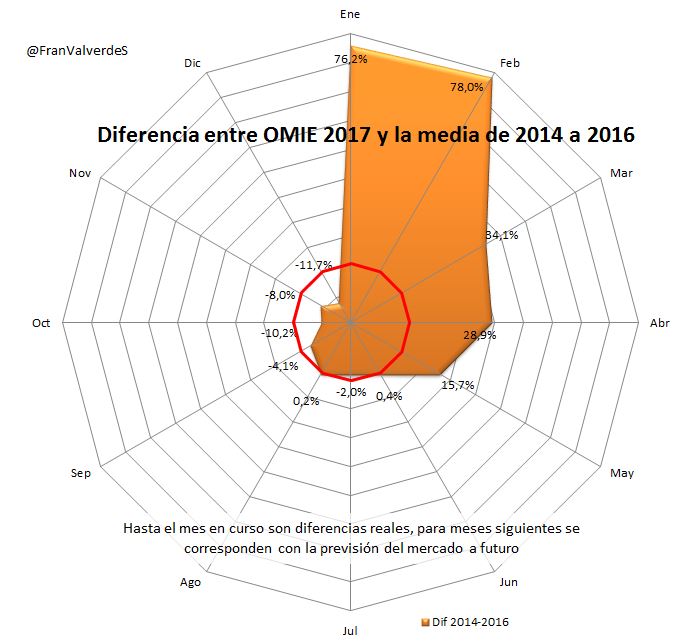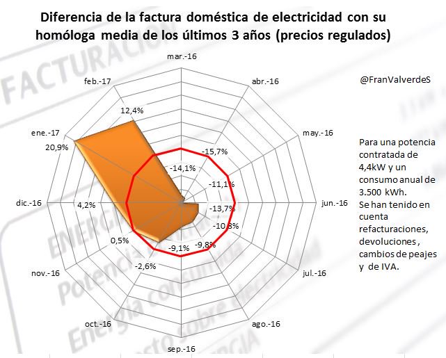 En la primera gráfica que representa la desviación de la factura con respecto a sus precios "normales" (círculo rojo) en cada mes (la factura media de los últimos 3 años) vemos como realmente es a partir de diciembre que hemos sufrido incrementos significativos, siendo el más grande el de enero.