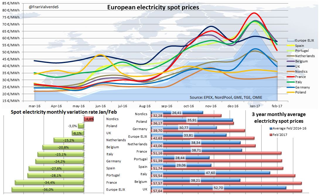 Termina Febrero en 51,74 €/MWh, esto es, con una bajada del 27,6% (recordemos que el maldito Enero cerró en 71,49 €/MWh), al igual que con los precios domésticos parece una bajada fenomenal (y lo es) pero las cosas hay que verlas en su contexto, fijémonos pues en otros febreros y comprobaremos que el de este año es superior en un 78% a la media de los 3 últimos siendo por tanto un mes comparativamente peor que Enero donde la diferencia con dicha media representaba un 76,2%. Esto es porque normalmente en febrero los precios suelen caer en picado, por la mayor generación renovable, mientras que este año sólo lo ha hecho "planeando" en parte, como se verá luego, por el menor aporte renovable de este año y en parte porque las fósiles siguen con precios altos.