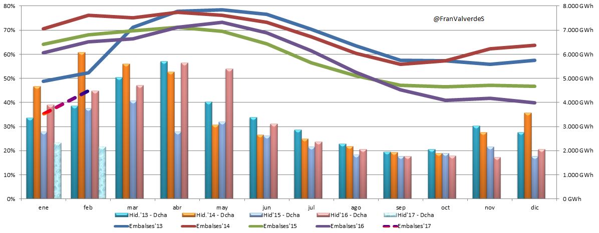 La primera fuente de febrero ha sido la eólica con un 24,4% seguida por nuclear (23,9%) y por último el carbón (16,8%). La hidráulica pasa a ser la 4ª fuente este mes (por muy poquito, porque las cogeneraciones han aportado casi lo mismo). Y es que, afortunadamente, por fin se ha empezado a embalsar agua (casi 10 puntos porcentuales desde enero), aunque como se aprecia en la gráfica, las reservas hidroeléctricas aún están muy abajo. Por consiguiente el aporte con agua también ha sido muy inferior al de otros febreros (prácticamente la mitad).