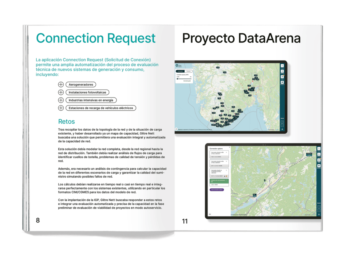 Para gestionar de forma más eficiente las solicitudes de conexión a la red de media tensión, Glitre Nett puso en marcha el proyecto DataArena, un mapa de capacidad de acceso para comprobaciones de capacidad de autoservicio. Aunque existía un mapa de capacidad, no incluía cálculos automatizados de carga de la red ni recomendaciones sobre puntos de conexión. Las funciones de simulación necesarias se implementaron mediante la IGP, que constituye el núcleo de cálculo del servicio, permitiendo realizar análisis de flujos de cargas y estimaciones iniciales de los costes de conexión.