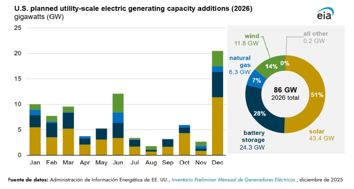 Los desarrolladores y operadores de centrales eléctricas estadounidenses planean añadir 86 gigavatios (GW) de nueva capacidad de generación eléctrica a escala de servicios públicos a la red eléctrica estadounidense en 2026, según el último informe del Inventario Preliminar Mensual de Generadores Eléctricos de la Administración de Información Energética de EEUU (EIA), un récord si dinalmente se concreta. La energía solar representa el 51% de las adiciones de capacidad planificadas para 2026, seguida del almacenamiento en baterías con el 28% y la energía eólica con el 14%.