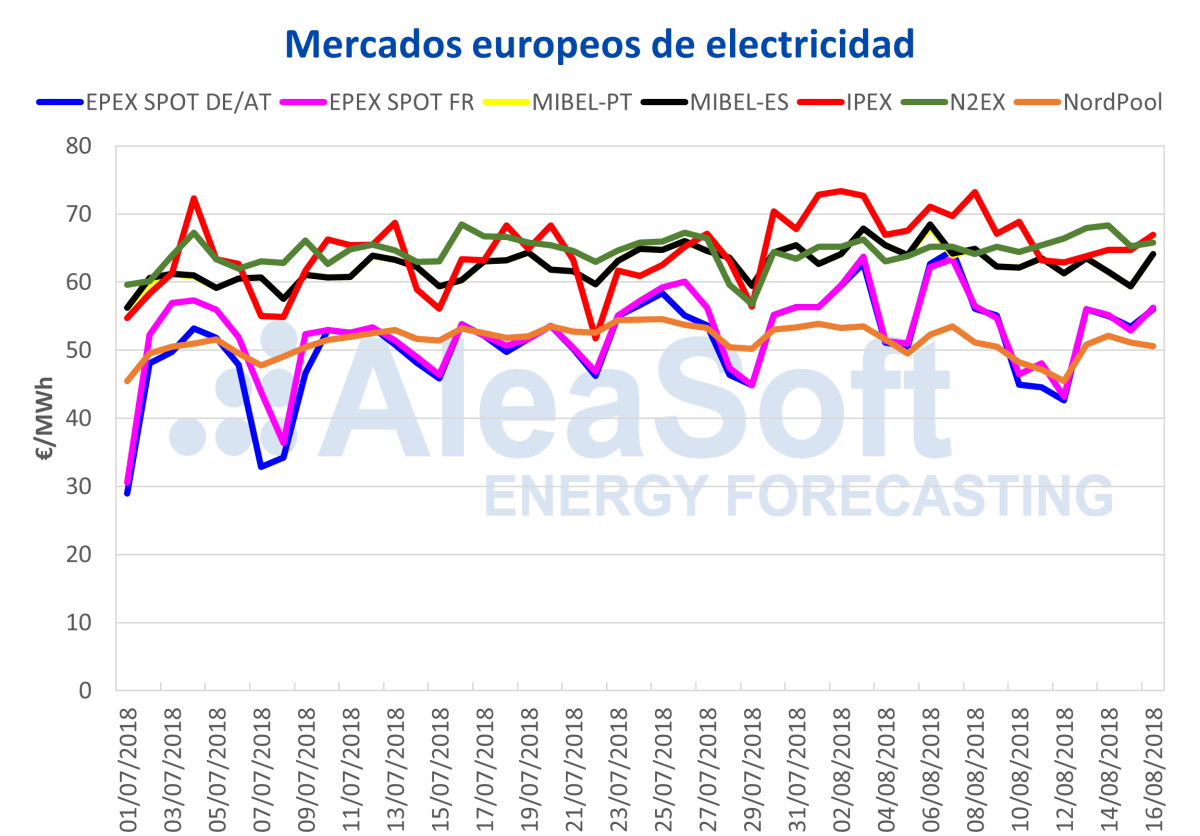 La ola de calor de los primeros días de agosto ha tenido un efecto claramente alcista en los principales mercados de electricidad de Europa, según los datos analizados por AleaSoft. Los más afectados han sido, por un lado, los mercados EPEX SPOT de Francia y de Alemania, donde el precio promedio entre el 2 y el 8 de agosto fue 7,94 €/MWh y 7,31 €/MWh más alto, respectivamente, que en los siete días siguientes, del 9 al 15 de agosto. Y, por otro lado, en el mercado italiano IPEX, donde esa diferencia de precio fue de 5,62 €/MWh. En el resto de mercados, esa diferencia fue menor, alrededor de 3,50 €/MWh en el mercado MIBEL español y portugués y de 2,77 €/MWh en el Nord Pool, e incluso en el mercado británico N2EX, los precios durante la ola de calor europea fueron ligeramente más bajos que en los días posteriores.