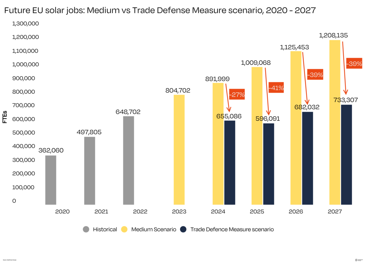 La declaración conjunta advierte de que las medidas de defensa comercial repercutirían negativamente en el empleo europeo y pondrían en peligro muchos puestos de trabajo locales y ecológicos. Si las medidas de defensa comercial se investigaran el año que viene y se aplicaran en 2025, nuestro último análisis sugiere una caída de 890.000 a 655.000 puestos de trabajo en 2024, y a menos de 600.000 en 2025.