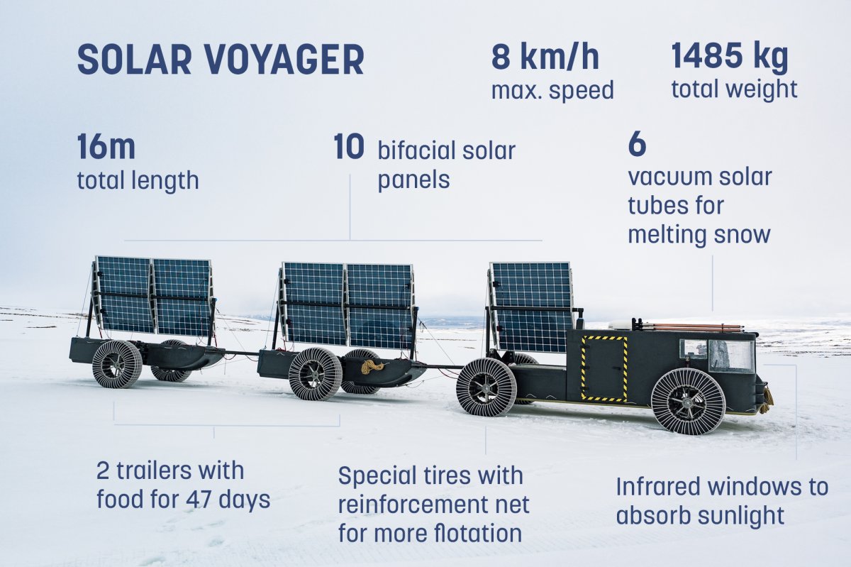La estrella central de la expedición, el Solar Voyager, tiene que ser capaz de hacer muchas cosas por su cuenta: desde proporcionar agua y conducir sobre la nieve o el hielo, a comunicarse con casa y mantener a sus ocupantes sanos y salvos durante 2.400 kilómetros que transcurren por algunos de los paisajes más implacables del planeta.