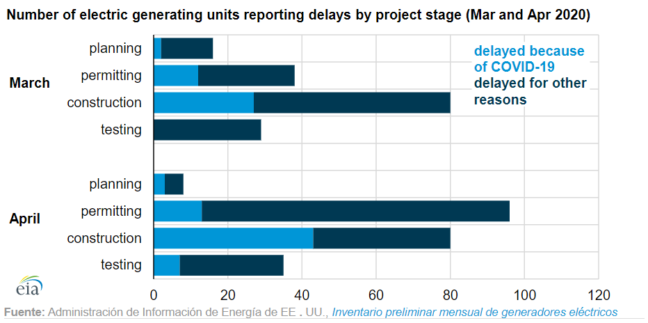 Todas las unidades generadoras que están planeadas para iniciar operaciones comerciales dentro de los 12 meses informan su estado a EIA. En marzo de 2020, 163 de las 772 unidades generadoras propuestas retrasaron su fecha de funcionamiento, y 41 citaron COVID-19 como motivo de retraso. De las 746 unidades generadoras que reportaron en abril, 220 fueron demoradas y 67 de ellas reportaron COVID-19 como una razón. Los retrasos atribuidos a COVID-19 durante estos dos meses representan 3,1 gigavatios (GW) de capacidad, o el 18% de la capacidad retrasada total. La media del retraso fue de dos meses, independientemente de si COVID-19 se citó o no como la causa del retraso.