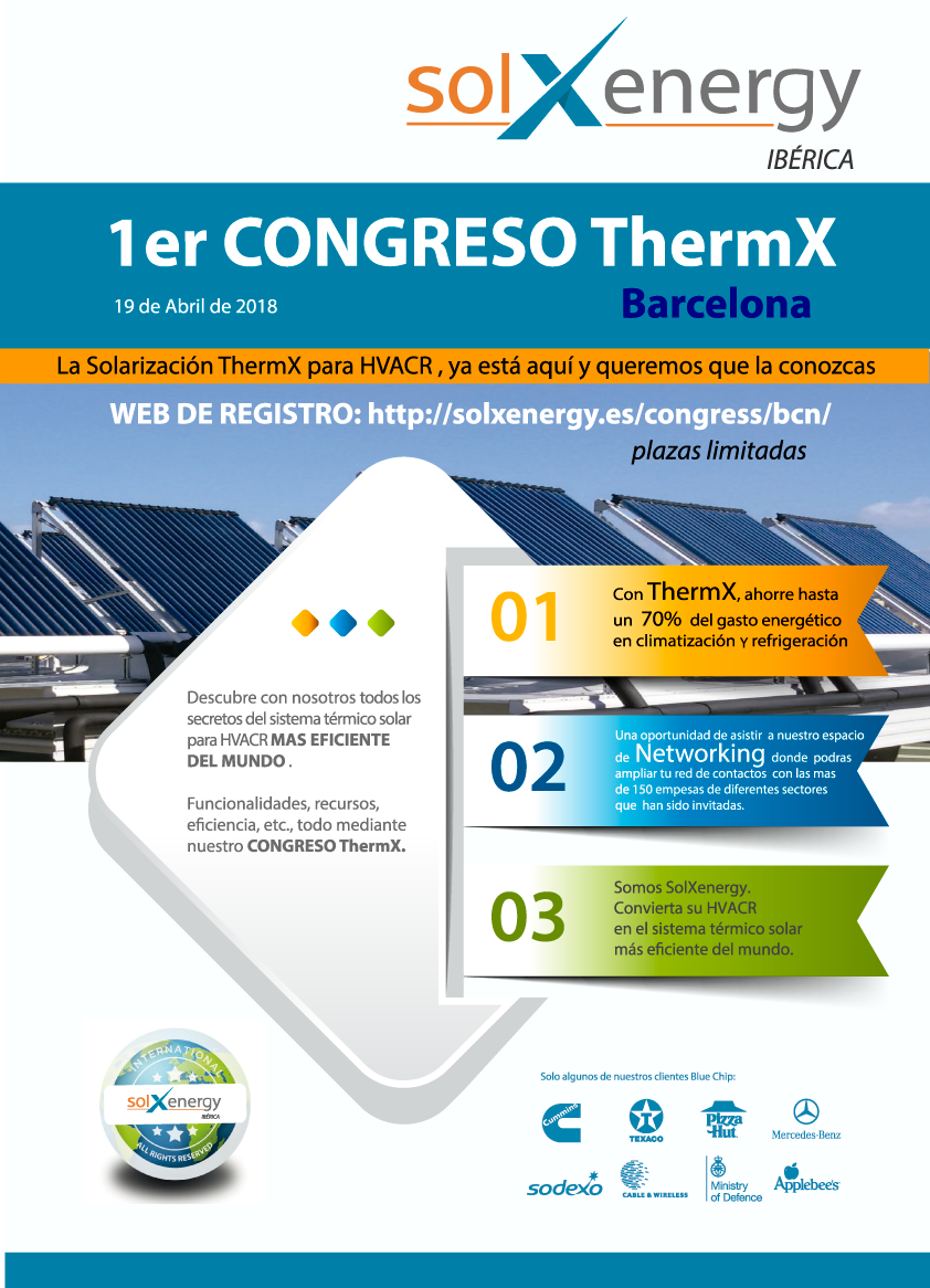El próximo día 19 de abril se presenta en Barcelona la tecnología térmico solar ThermX, a cargo de SolXenergy Ibérica, empresa de distribución para España y Portugal de la multinacional SolXenergy, que promete reducciones en los consumos eléctricos del 30% al 40% en los equipos de refrigeración y aire acondicionado (HVAC/R).