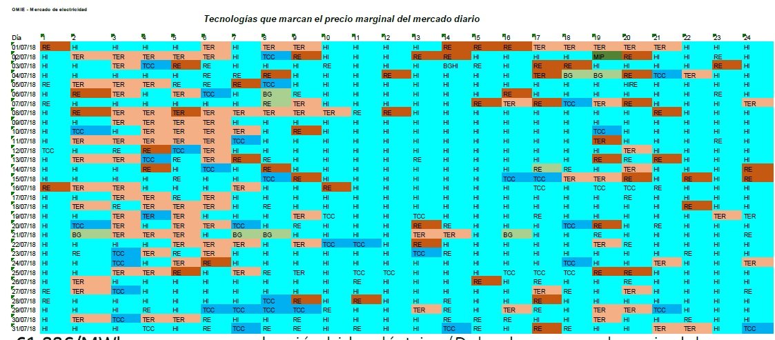 El siguiente cuadro indica que generación marca el precio de la electricidad por hora (elaboración OMIE).
