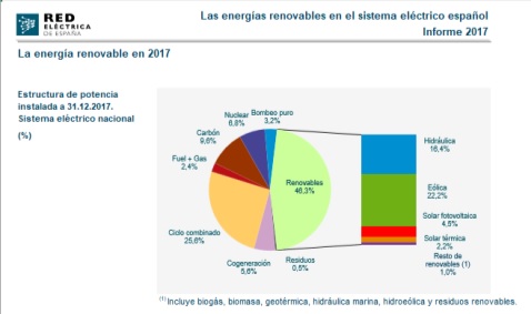 La potencia instalada en España de generación de electricidad es de 59.818,9 MW, siendo el 19,5% del total La capacidad de generación hidroeléctrica en España, potencia solamente superada por los ciclos combinados de gas, que con un total de 27.200 MW es la primera tecnología por potencia instalada suponiendo un 24,8% del total. La energía eólica supone un 23.002 MW de potencia instalada que equivale a un 22,3%.