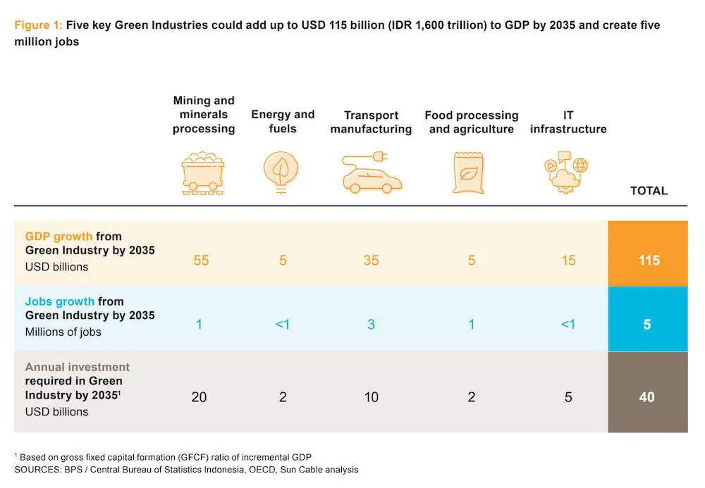 Pero el plan más amplio es construir cinco industrias clave identificadas en un estudio conjunto que tienen el potencial de sustentar el crecimiento verde y sumar 171.000 millones de dólares (unos IDR 1,600 billones) al PIB de Indonesia para 2035.