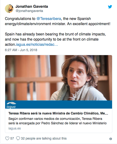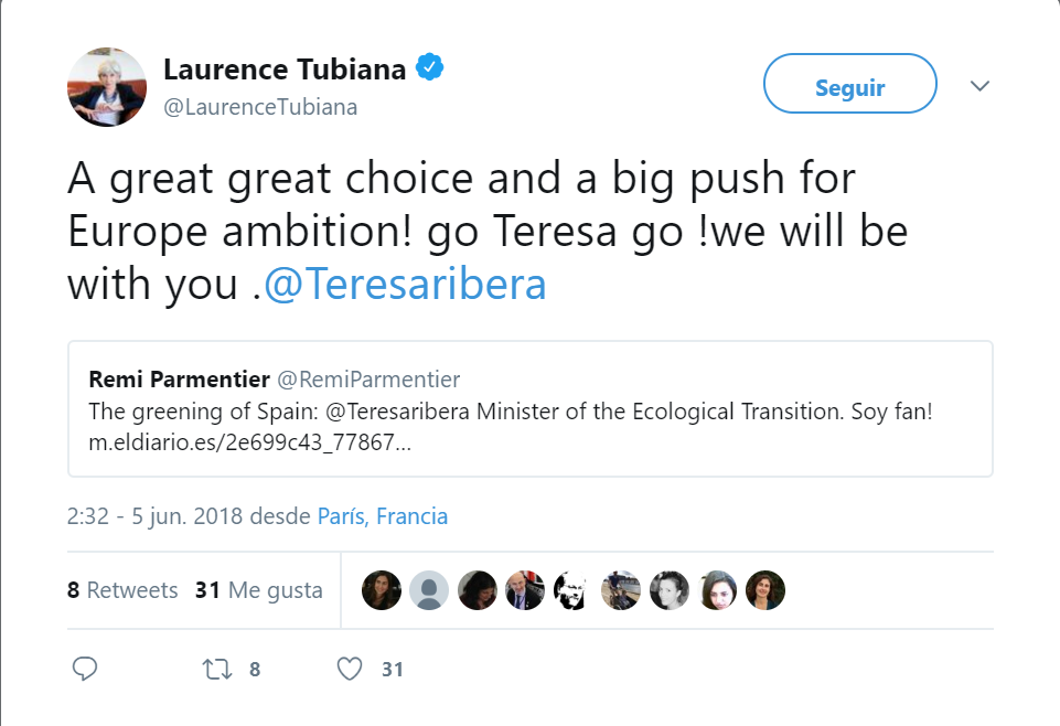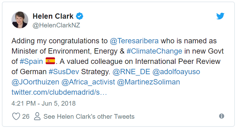 Entre los primeros personajes que le han transmitido su felicitación por su próximo nombramiento se encuentran, por ejemplo, Laurence Tubiana, una arquitecta francesa clave en el Acuerdo de París, la ex primera ministra de Nueva Zelanda, Helen Clark, o el director de E3G en Bruselas, Jonathan Gaventa, tal y como puede verse en los siguientes tuits.