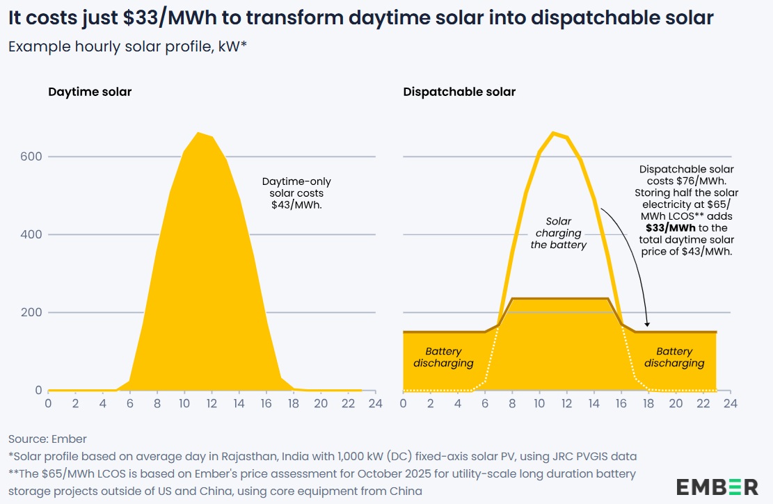 El costo de almacenar energía solar durante el día para su uso como electricidad en cualquier momento se redujo a 65€/MWh en 2025, según un nuevo análisis de Ember.