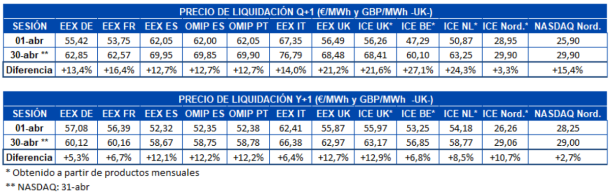 Si se analizan la primera y última sesiones de los mercados de futuros del mes de abril, se puede apreciar claramente una subida generalizada de los precios del próximo trimestre, Q3-21. El mercado ICE de Bélgica fue el de mayor incremento de precios entre estas sesiones con un aumento del 27%. Por otra parte, el mercado ICE de los países nórdicos fue el de menor variación con una subida del 3,3%. En el resto de mercados los incrementos se situaron entre el 12% y el 25%.