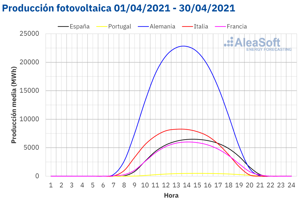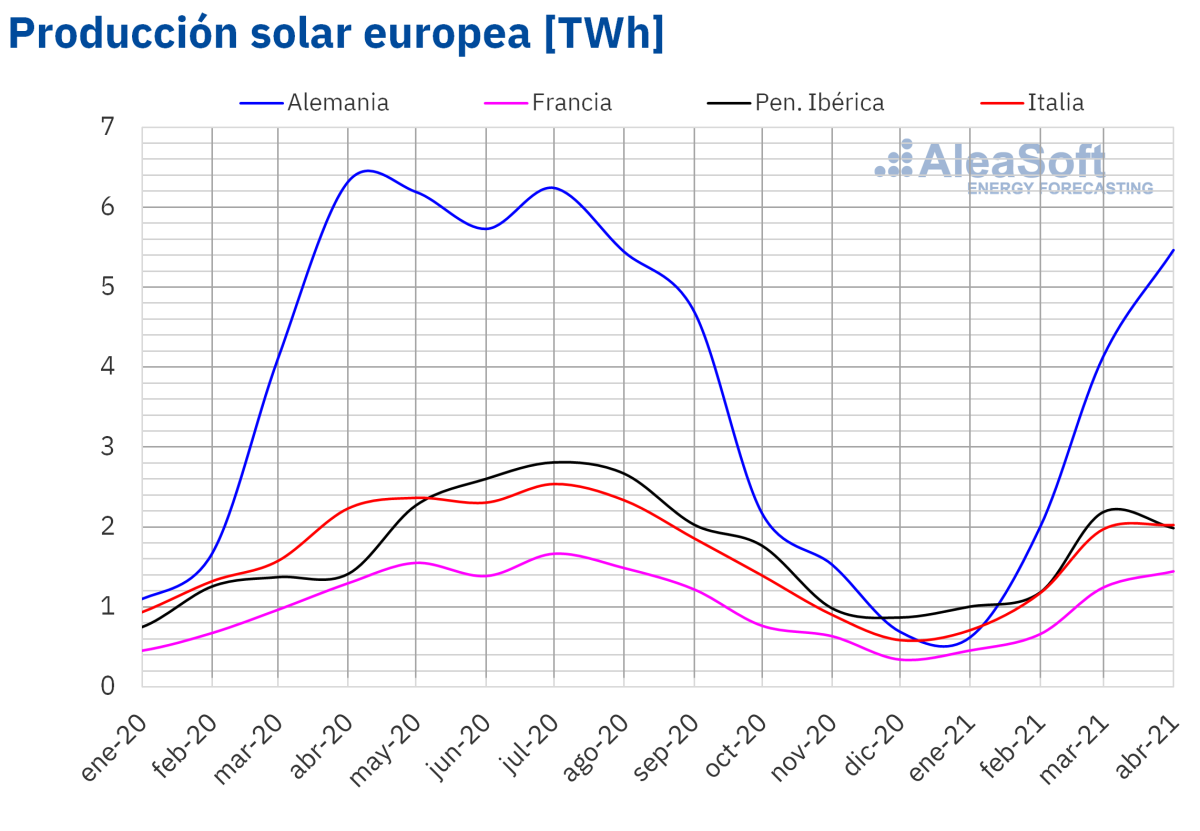 La producción solar durante el mes de abril, aumentó en la mayoría de los mercados europeos analizados en AleaSoft, en comparación con el mes de abril de 2020. En el mercado español la producción solar, que incluye la solar térmica y la fotovoltaica, aumentó un 36%. En Portugal creció cerca del 34% mientras que en Francia el aumento fue del 11%. Por el contrario, en los mercados de Italia y Alemania la producción se redujo un 9,3% y un 14% respectivamente.